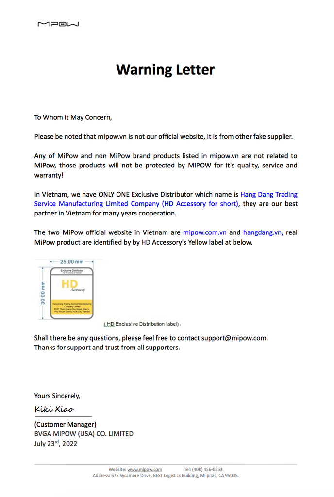 The two MiPow official website in Vietnam are mipow.com.vn and hangdang.vn, real MiPow product are identified by by HD Accessory's Yellow label at below.