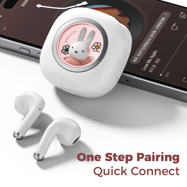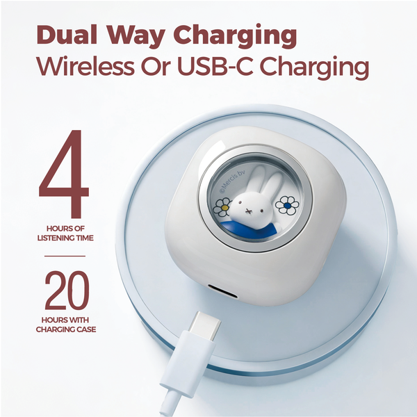 The Miffy Bluetooth Wireless EarBuds Pro combine adorable design with advanced audio performance. Featuring a semi-exposed charging case with LED ambiance and a Miffy figurine, Bluetooth 5.3 connectivity, HD stereo sound, intuitive touch controls, wireless and USB-C Dual charging experience, extended playtime, and IPX5 water resistance—perfect for active users and Miffy collectors alike.