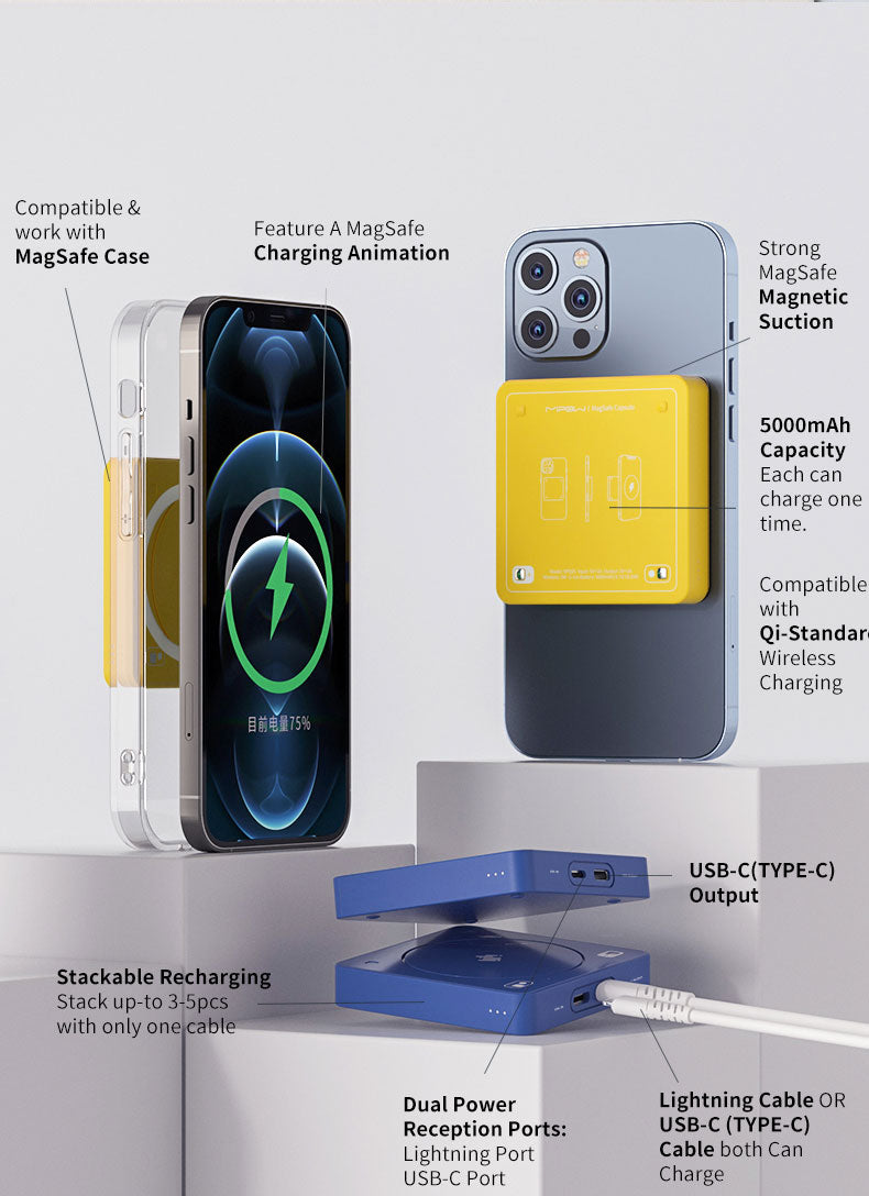 1 Pack of Duo Capsule comes with 2 Magnetic MagSafe Power Bank Capsules, Each Capsule comes with 5000mAh. Stackable recharging design. Charge 2 Capsules and 1 iPhone by only one cable.