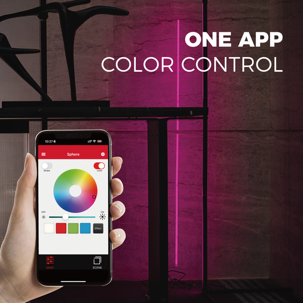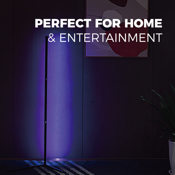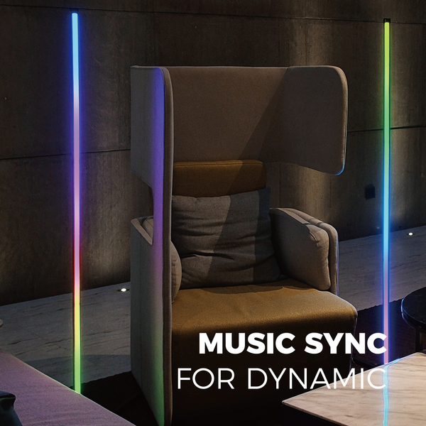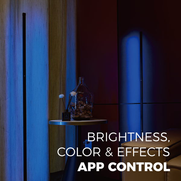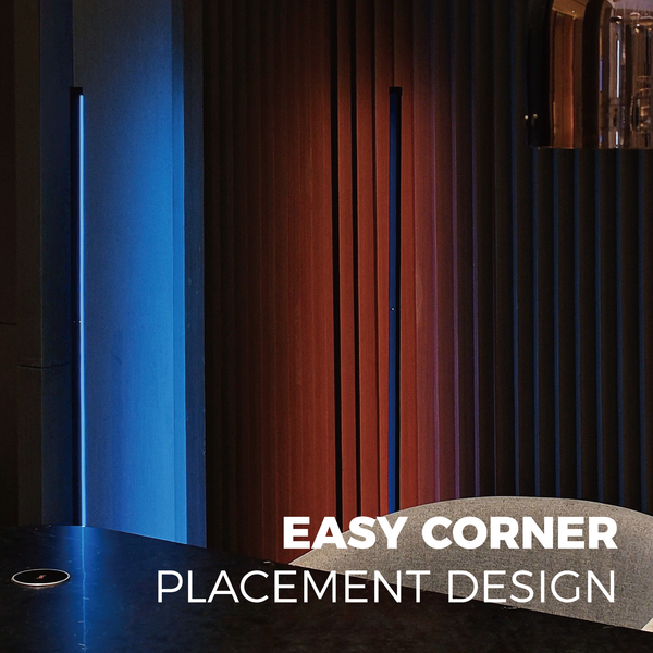 PLAYBULB Floor is a sleek RGB corner floor lamp 57'inch/143cm Height,featuring App control, remote control, music sync, and warm-white lighting. Designed with a minimalist tube-style frame, it elevates living rooms, bedrooms, and gaming setups with immersive ambient color scenes and customizable lighting effects for modern home décor.