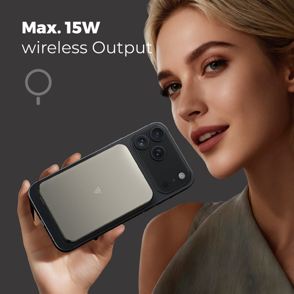 Delivers 15W MagSafe wireless charging for iPhones. The USB-C port offers 20W output/input for efficient charging and quick power recovery.
